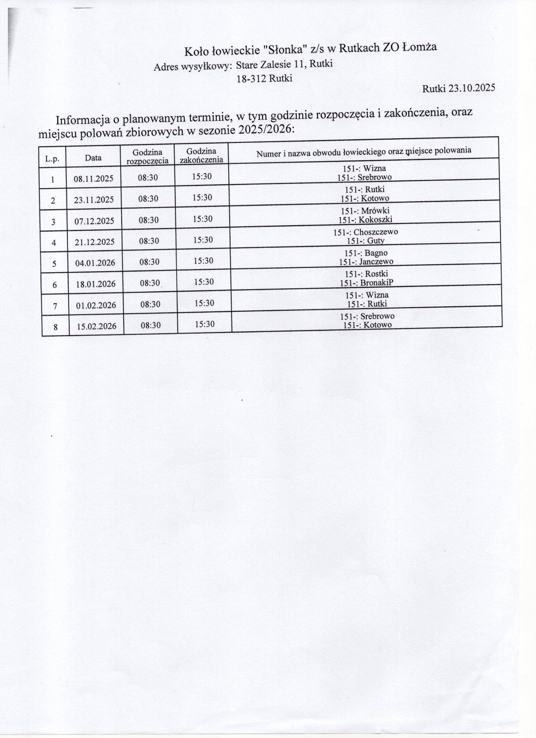 Informacja Koła łowieckiego „Słonka” o planowanych terminach polowań zbiorowych w sezonie 2025/2026